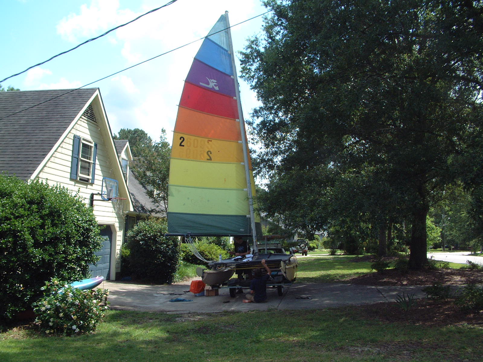 The Carolina Voyaguer II is a 16' Hobie Catamaran. She was manufactured in 1977. The sail number is 26095. I paid $1 and some major tree work.
